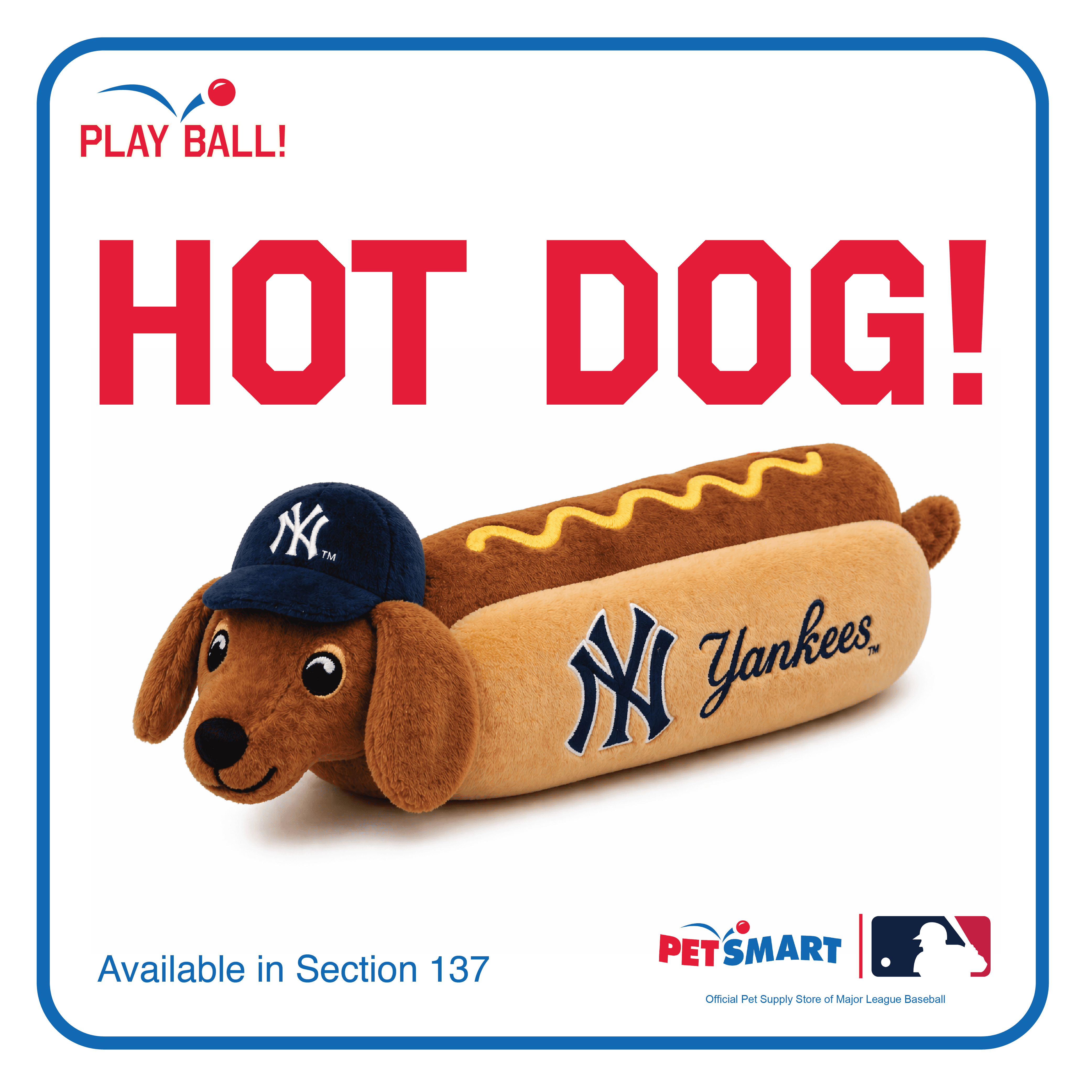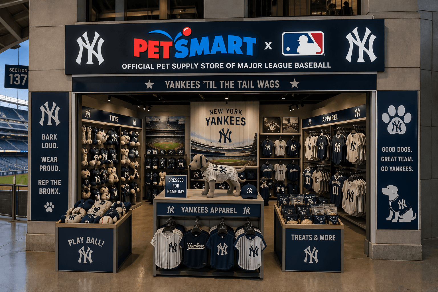 PetSmart will open team-specific merch stores in MLB stadiums across the nation. In this example, the store is located in section 137 of Yankee Stadium. (Let's go Yanks!) The store will include pet player jerseys, baseball themed toys, and treats like you would get at concessions.